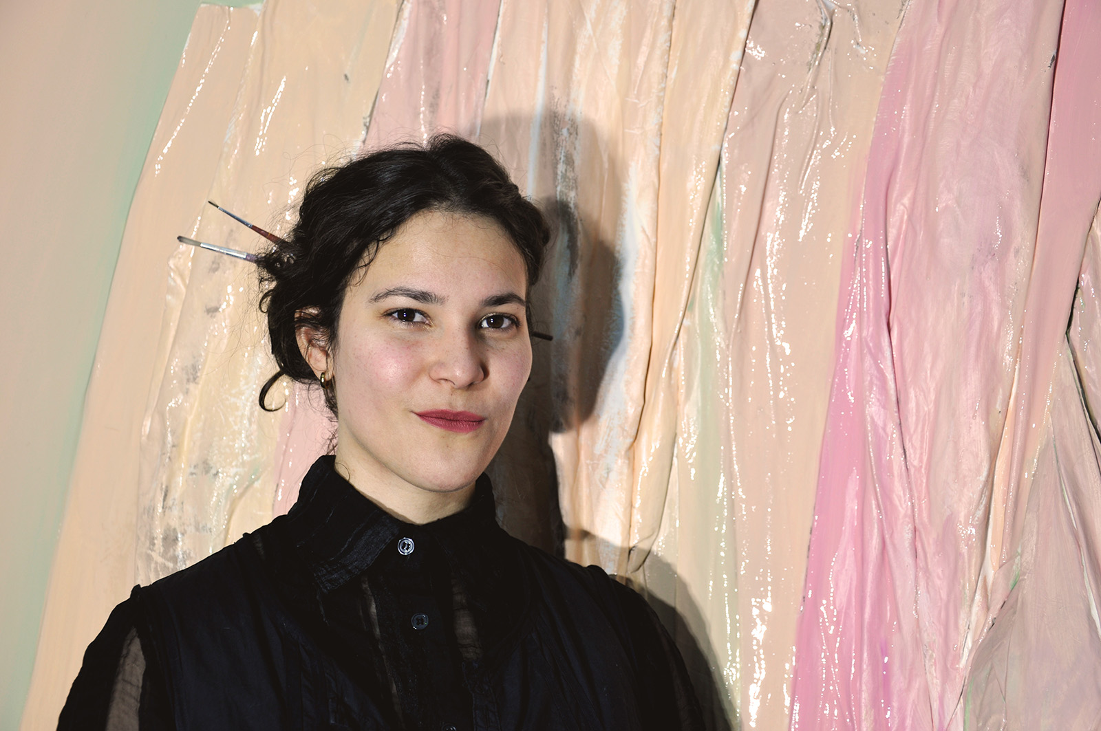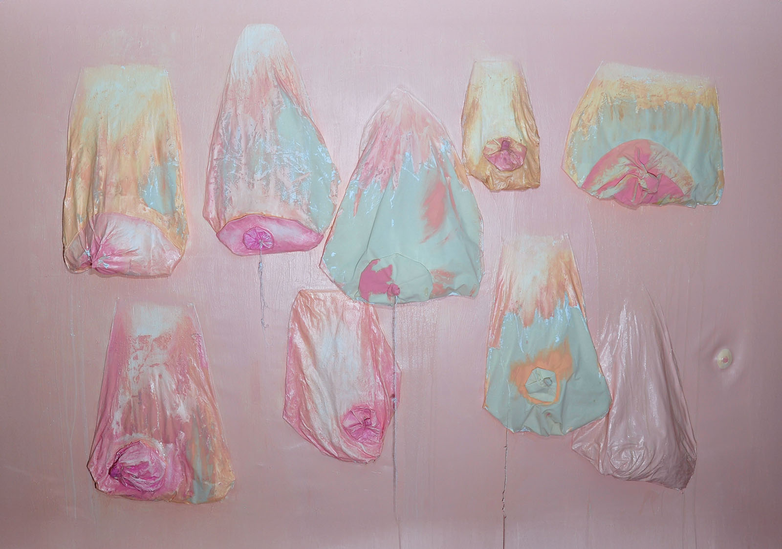 and resin, thus acquiring a third dimension. She plays with soft pastel colours and hard shapes or symbols to illustrate to the